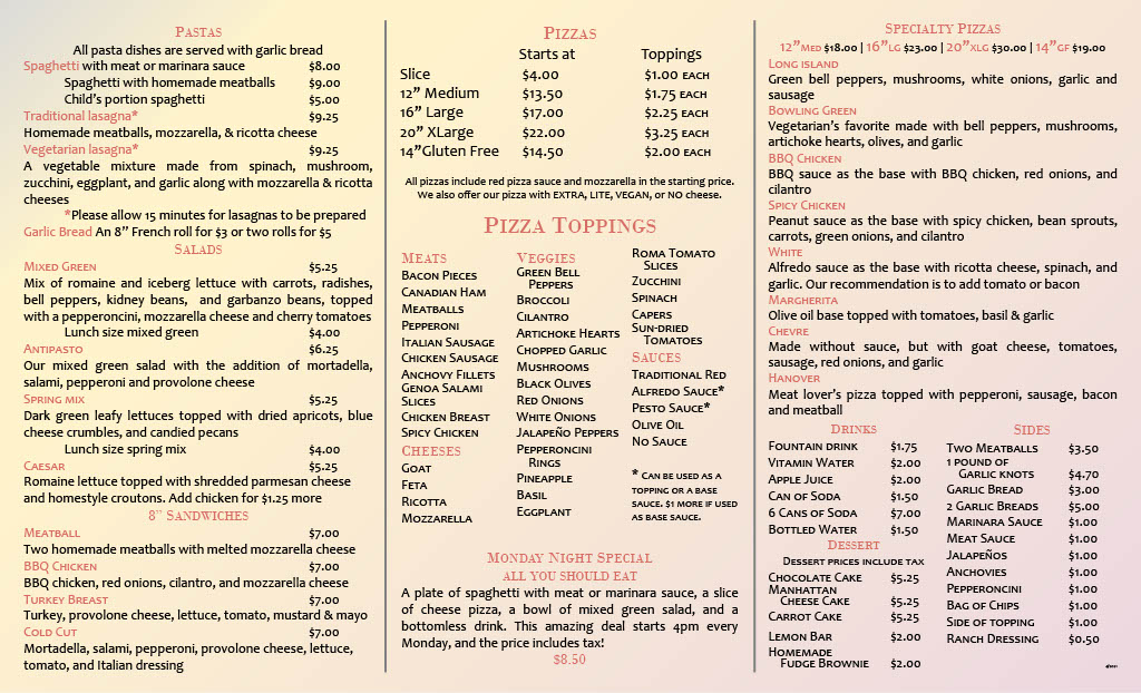 Don’t miss their fantastic Monday Night Special, which includes a colossal pizza slice, savory spaghetti with sauce, garlic knots, and a fresh salad—all for just $11.99. The friendly staff ensures that every guest feels at home, and the complimentary treats, like delightful brownies and garlic knots, add a special touch to your visit.